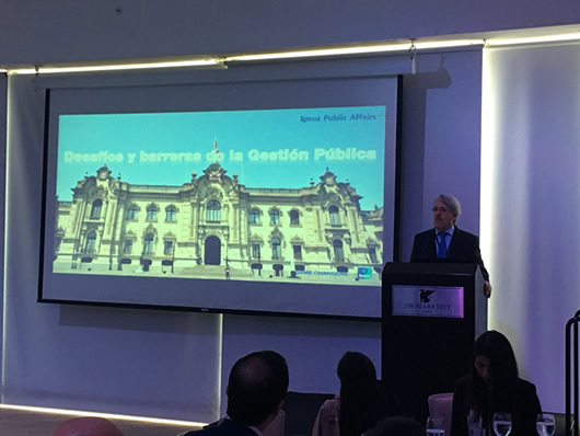 Alfredo Torres, Presidente Ejecutivo de Ipsos Perú, presentó los principales resultados de una encuesta sobre los desafíos y barreras de la gestión pública, que se aplicó entre los expertos que asistieron el evento. La investigación encontró que las principales barreras que el Estado enfrenta actualmente en la gestión pública son el exceso de procesos burocráticos (44%), la falta de coordinación intersectorial (42%) y personal ineficiente (29%). Asimismo, solo 1 de cada 10 entrevistados consideró que los funcionarios públicos del país son eficientes, y que 1 de cada 5 que los funcionarios son honrados. Además, se encontró que el Estado cuenta información insuficiente del ciudadano para formular mejores políticas públicas; solo 18% de los funcionarios públicos tiene información suficiente para la toma de decisiones en su trabajo.