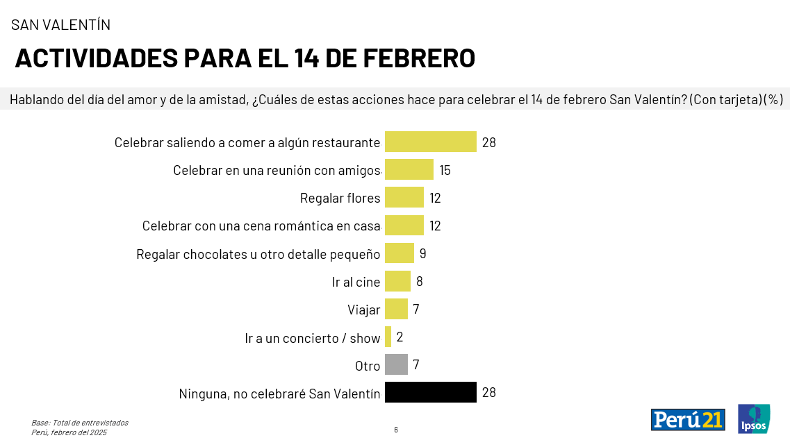 Entre las actividades que planea realizar el 14 de frebrero se encuentran principalmente celebrar saliendo a comer a algún restaurante (28%), celebrar en una reunión con amigos (15%), regalar flores (12%) y celebrar con una cena romántica en casa (12%).