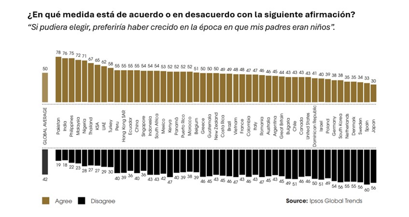 En el Perú, el 55% de las personas está de acuerdo con la afirmación: “si pudiera elegir, preferiría haber crecido en la época en que mis padres eran niños”. Un reflejo de la mirada retrospectiva idealizada y del fuerte deseo de aferrarse al pasado frente a un futuro incierto.
