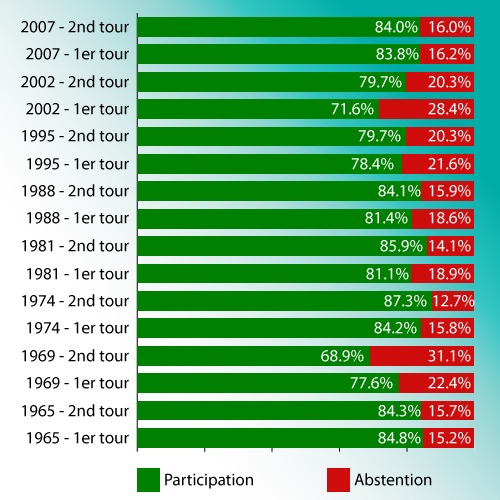 Le taux de participation à 17h pour le premier tour de l'élection Présidentielle 2012 s'élève à 70,59%, selon un communiqué du Ministère de l'Intérieur. Ce taux est inférieur à celui relevé à la même heure en 2007 (73,87%). Le record de participation sous la Vième République au premier tour de la Présidentielle remonte à 1965 (84,8%) ; la plus faible participation a été enregistrée au premier tour du scrutin de 2002 (71,6%). Rendez-vous à 18h15 pour l'estimation Ipsos / Logica Business Consulting de la participation au scrutin.