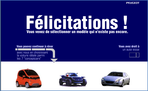 Sur le site Internet de Peugeot, si le visiteur fait une faute d'orthographe en tapant le nom d'un modèle, au lieu d'un message d'erreur, le site affiche ceci : « Félicitations ! Vous venez de sélectionner un modèle qui n'existe pas encore. Aidez-nous à le créer. » Puis le visiteur est dirigé vers la page des prototypes.