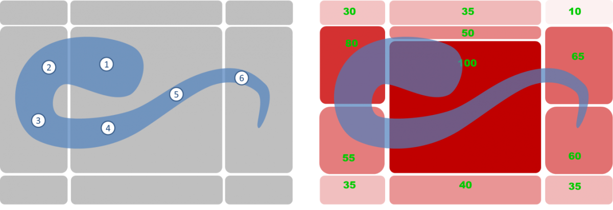 La carte de densité de clics présente les zones où l'impact est le plus élevé. Le pourcentage moyen des visiteurs ayant vu chacune des zones s'entend 20 secondes après le début de l'exposition. À chaque étape, le site Internet perd une partie de son public. L'impact commence à 100 % sur la meilleure zone, puis baisse rapidement.
