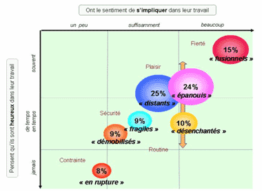 Une fois dressés ces premiers constats, on remarque cependant qu'implication ne rime pas toujours avec bonheur au travail et, à l'inverse, que bonheur ne rime pas toujours avec implication. Une " cartographie " plus détaillée permet d'illustrer cette analyse et d'identifier quelques profils types :