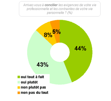 De nombreux spécialistes insistent sur les difficultés que rencontreraient les salariés notamment pour concilier les exigences de leur vie professionnelle et les contraintes de leur vie personnelle. Les résultats du Baromètre Accor Services relativisent la portée de ce problème. Dans leur grande majorité, les salariés interrogés estiment arriver à concilier ces deux dimensions (voir graphique ci-dessous).