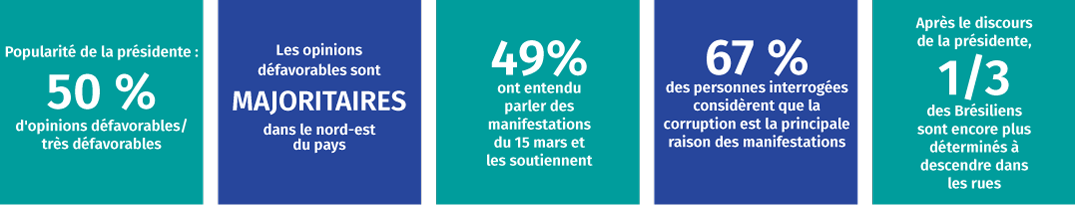 Même dans les régions où la présidente brésilienne avait toujours bénéficié d'un soutien plus marqué que dans le reste du pays, la popularité de Dilma Rousseff est en baisse. Dans le nord-est du Brésil, son taux d'opinions favorables/très favorables est passé de 46 % fin 2014 à 32 % en février 2015, tandis que son taux d'opinions défavorables/très défavorables a augmenté de 14 % pour atteindre 34 %. Il s'agit de la cote de popularité la plus faible enregistrée par #PulsoBrasil pour un chef d'État depuis son lancement il y a 10 ans.