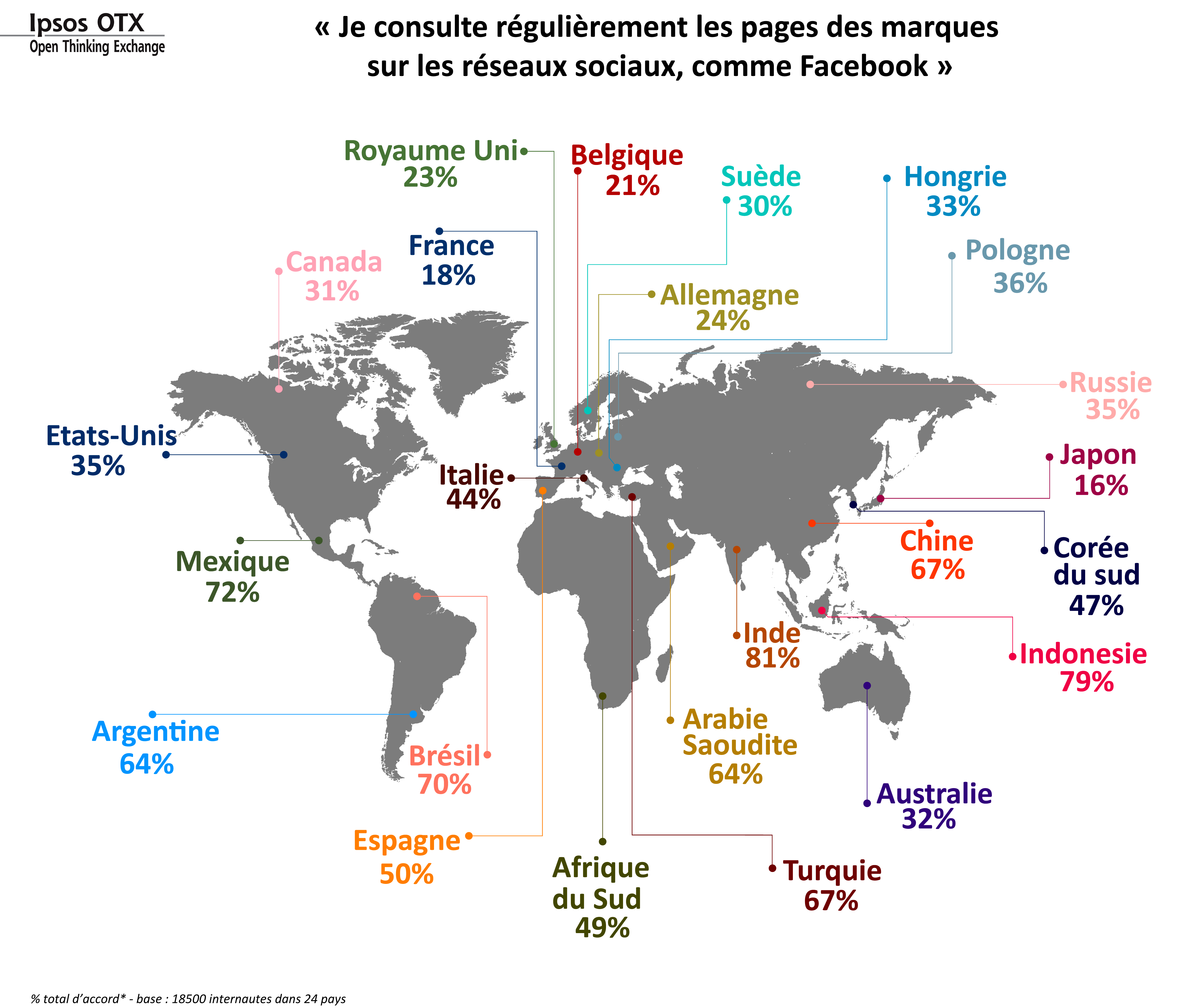 45% consultent régulièrement les pages des marques sur les réseaux sociaux !Avec mondialement 45% des internautes qui consultent régulièrement le contenu de marques sur les réseaux sociaux, le scepticisme des marketeurs quant à l’intérêt de développer un Owned Media de qualité, est en train de fondre comme neige au soleil. Les moins de 35 ans, déclarent même leur attachement au Brand Content sur les media sociaux de façon majoritaire (54%).Qu’ils soient attirés par un jeu concours ludique, par une promotion proposée exclusivement aux fans ou qu’ils soient à la recherche d’une info chaude ou d’un espace où partager leurs opinions et exprimer leur fort attachement, les socionautes considèrent d’une certaine façon leurs marques comme des « amies ».Ce niveau de consultation est particulièrement élevé dans certains pays, pour lesquels une stratégie de Brand Content réussie est en passe de devenir un must : Indes (81%), Indonésie (79%), Mexique (72%), Brésil (70%), etc…Avec autant de consommateurs engagés vis-à-vis des marques, il devient plus que fondamental de créer un contenu riche qui, in fine, aura pour vocation à nourrir une stratégie de Earned Media solide et pérenne.Mais qu’en est-il de la France ? La consultation du contenu de marques sur les réseaux sociaux, n’est déclarée que par 18% des internautes français. A nouveau cela confirme le besoin d’une stratégie hybride qui connecte au mieux le monde digital au monde réel, avec par exemple l’annonce des lancements de nouveaux produits, d’évènements hors media, de nouvelles campagnes publicitaires, etc…