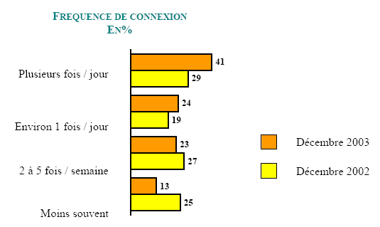 En 2003, l’utilisation d’Internet s’est nettement intensifiée. 41% se connectent aujourd’hui plusieurs fois par jour (vs 29% en décembre 2002). Les internautes ne sont plus que 13% à se connecter « moins souvent que 2 fois par semaine » (vs 25% en décembre 2002)