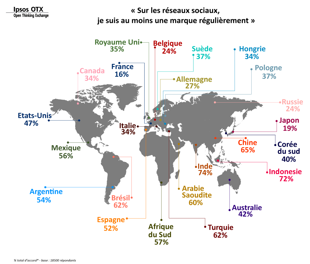 44% des internautes se disent engagés vis à vis des marques sur les réseaux sociaux.Observer, lire, s’informer sur l’actualité d’une marque, c’est une chose. Etre engagé vis-à-vis de celle-ci en est une autre. 44% des internautes à travers le monde déclarent suivre et être engagés vis-à-vis des marques sur les réseaux sociaux. Le quotidien d’un fan, activement connecté aux marques, est bien connu : le « liking » d’une marque ou d’un de ses produits, les commentaires associés, les recommandations éventuelles et bien sûr le partage avec sa communauté. Une disposition qui lui permet de suivre l’actualité des marques et de temps à autre de bénéficier d’exclusivités, de promotions et plus régulièrement d’un contenu ludique et en phase avec ses aspirations.On s’en serait douté, les moins de 35 ans se déclarent particulièrement engagés vis-à-vis des marques sur les réseaux sociaux (55% vs 42% pour les 35-49 et 27% parmi les plus de 50 ans).On note également de fortes différences régionales à travers le monde. Les internautes se déclarant les plus engagés se trouvent en Inde (74%), en Indonésie (74%), au Brésil (65%) et en Turquie (62%). Le taux d’engagement en France semble en retrait (16%), ce qui prouve à nouveau le besoin de stratégies hybrides, utilisant le digital et les media traditionnels.Il est important de rappeler qu’une marque qui a séduit un nouveau fan ou follower, doit ensuite faire en sorte que la relation s’amplifie et se renforce avec le temps, en transformant, idéalement, ce consommateur nouvellement engagé en un ambassadeur de marque.