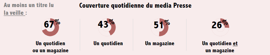 Chaque jour, 34,4 millions de personnes, soit 67% de la population âgée de 15 ans et plus, lisent au moins un titre de presse. Chaque jour ils sont 43% à lire au moins un quotidien (près de 22 millions) et 51% à lire au moins un magazine (près de 26 millions).