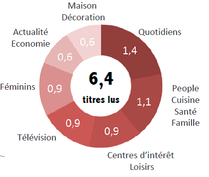 Les Français lisent en moyenne 6,4 titres différents, parmi lesquels on retrouve en moyenne 1,4 quotidiens et 5,0 magazines. Parmi les gros lecteurs de presse, on trouve les femmes et les individus âgés de 35 à 49 ans, avec respectivement 7,1 et 6,6 titres lus en moyenne. |
