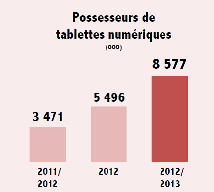 Du coté des tablettes numériques, la croissance est vertigineuse : 16,7% des français en possèdent une en 2012/2013 soit 8,6 millions d’individus (x 2,5 en 1 an).