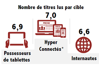 Pour preuve, le nombre de titres lus par les internautes, les possesseurs de tablette ainsi que par les « hyper-connectés » (*possesseurs à la fois d’un ordinateur, d’une tablette et d’un smartphone) est supérieur à la moyenne.