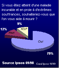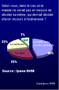 Les résultats d'autres enquêtes d'opinions réalisées en France vont tous dans le même sens : 85% des personnes interrogées par la Sofres pour la Sélection du Reader's Digest (2) estiment "qu'il faut laisser aux personnes très malades la possibilité de mourir si elles le désirent". Les Français sont à peine plus partagés lorsqu'il s'agit de se prononcer sur le cas d’un proche confronté à la même situation désespérée. Selon l'étude Ipsos de septembre 1998, 61% des personnes se déclarent prêtes à l'aider à mourir.Compte tenu de la réticence à provoquer ou à anticiper la mort d'un tiers, le fait que plus de six personnes sur dix pensent être capable de "décider d'aider un proche à mourir" est particulièrement significatif de l’attitude de l'opinion publique française sur la question de l'euthanasie.