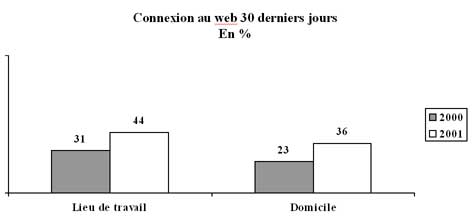 De même que l'accès à Internet, la connexion au web au cours des 30 derniers jours a fortement crû cette année : elle concerne 44% des cadres sur leur lieu de travail et 36% depuis leur domicile.