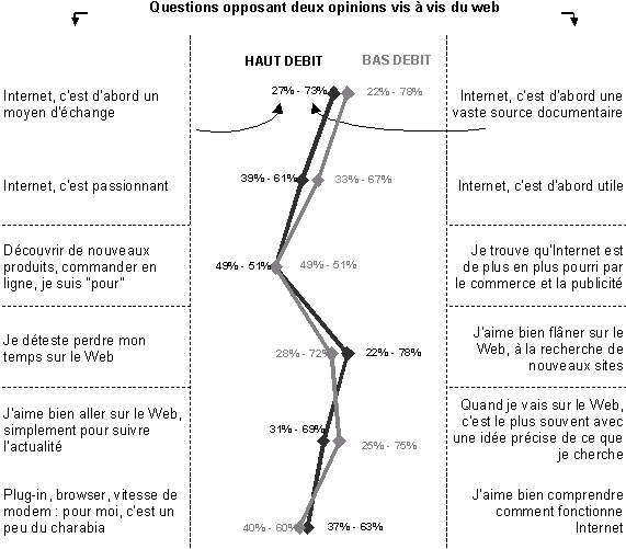 Les connectés Haut Débit ont, vis à vis d'Internet, une attitude plus ludique et plus axée vers l'échange. Leur approche est également plus passionnée et plus attentive aux aspects techniques d'Internet.
