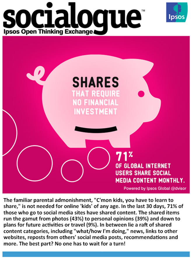 Ces chiffres sont assez modestes en comparaison avec d’autres pays : notre enquête indique que sur 24 pays, 71% des internautes déclarent partager. Les plus « partageurs » sont assurément les Turcs (93% d’entre eux ont partagé au moins un contenu le mois passé), Mexicains, Brésiliens, Indiens, Indonésiens et Chinois se situant entre 90% et 85%. A l’inverse, on observe chez les pays matures une plus grande réserve à partager des contenus sur les réseaux sociaux : Grande-Bretagne (58%), France (49%), Allemagne (44%) et Japon (30%) figurant en queue de peloton.