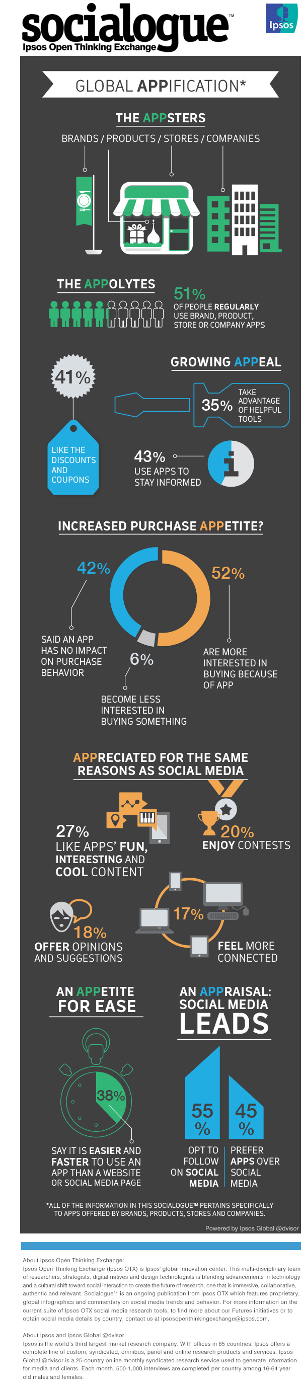 La pénétration des Smartphones rend la diffusion des applications mobiles plus aisée : elles sont largement exploitées – marque, magasin, service, entreprise – et utilisées régulièrement par 51% des répondants. Au-delà du côté pratique – horaires etc – qui justifie à lui seul 35% des usages, c’est l’information en temps réel ou le couponing qui motivent avec plus de 41% dans les deux cas. Cependant, les réseaux sociaux gardent une longueur d’avance avec 55% pour le suivi des marques – importance du temps réel et des fonctionnalités propres – même si 38% des répondants vont trouver les applications plus ergonomiques que les sites Web.