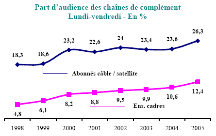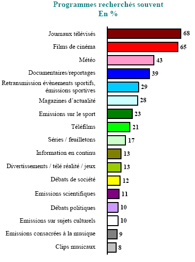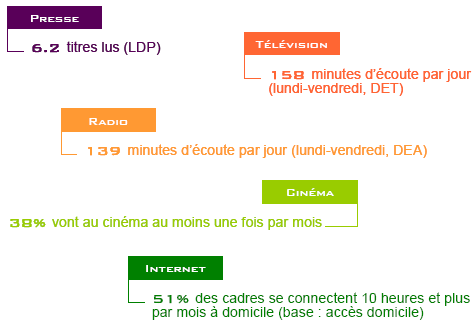 Ils lisent en moyenne 6.2 titres de presse parmi les 78 supports étudiés dans l’enquête. Ils sont 77% à regarder la télévision en semaine (audience cumulée jour moyen) pour une durée d’écoute par téléspectateur de 158 minutes. Une durée d’écoute qui atteint 215 minutes par téléspectateur le week-end. L’écoute de la radio en moyenne chaque jour du lundi au vendredi rassemble plus de 86% des cadres (audience cumulée jour moyen) pour une durée d’écoute par auditeur de 139 minutes. Ils se déclarent également cinéphiles pour 38% d’entre eux en fréquentant les salles de cinéma au moins une fois par mois. Internet est devenu un outil utilisé au quotidien : 51% se connectent 10 heures et plus par mois à leur foyer. Au cours des 30 derniers jours, ils sont 79% à s’être connectés sur leur lieu de travail et 64% à domicile. ![]() Télévision Parmi les programmes recherchés « souvent » à la télévision, les journaux télévisés et les films de cinéma occupent les deux premières positions. Les jeunes cadres de moins de 35 ans plébiscitent par rapport à l’ensemble des cadres les films de cinéma, les séries / feuilletons, les programmes de divertissement – téléréalité – jeux, les clips musicaux. Les femmes cadres plébiscitent par rapport à l’ensemble des cadres les magazines d’actualité, les téléfilms, les séries/feuilletons, les programmes de divertissements, les débats de société. Les cadres hors entreprises, de leur côté, plébiscitent les débats politiques et les émissions sur des sujets culturels. ![]() La part d’audience lundi-vendredi des chaînes du câble et du satellite a progressé sensiblement en un an, passant de 23.6% à 26.3%. Mais les chaînes hertziennes maintiennent leur prédominance avec 74% de parts d’audience, que ce soit la semaine ou le week-end. ![]()