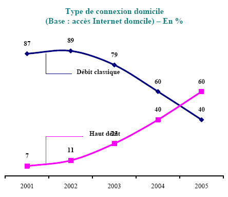 Le « haut débit » est devenu le mode d’accès majoritairement choisi par les cadres pour leur connexion à domicile. 6 cadres sur 10 disposent d’un système haut débit (câble ou ADSL). ![]()
