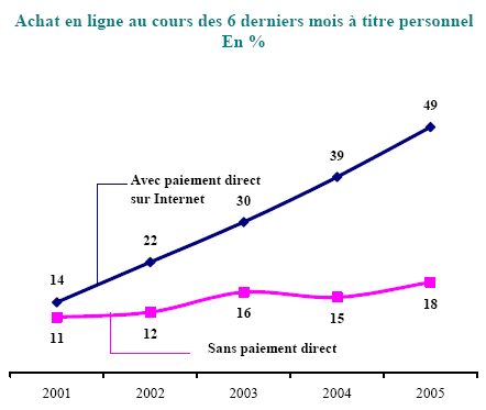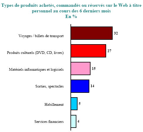 ![]() Les cadres ont utilisé Internet en premier lieu pour acheter, commander ou réserver des produits de voyages ou des billets de transport (32%). 27% d’entre eux ont acheté on line des produits culturels. L’habillement devient un secteur émergeant auprès de cette population cadres. ![]() |