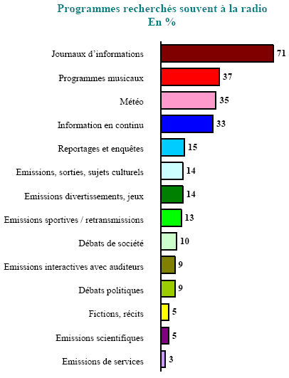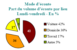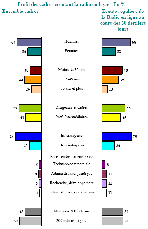 Radio Les journaux d’information constituent de loin le premier type de programmes recherchés à la radio par les dirigeants et cadres. Par rapport à l’ensemble des cadres, les dirigeants et cadres plébiscitent les journaux d’information et les programmes d’information en continu. Les jeunes cadres de leur côté plébiscitent les programmes musicaux, les émissions de divertissement – jeux, les émissions interactives avec les auditeurs. ![]() La voiture demeure le lieu qui rassemble le plus d’auditeurs cadres durant la semaine (42%), devant le domicile (56%). La radio désormais écoutée également sur Internet et le câble / satellite
