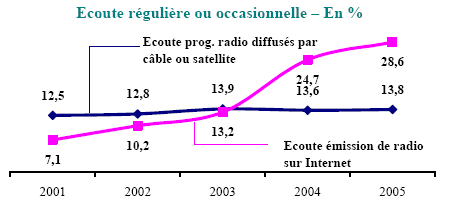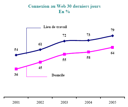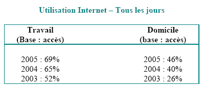 ![]() Internet 92% des cadres se sont connectés au Web au cours des 30 derniers jours. Le nombre de cadres s’étant connectés au Web aussi bien sur le lieu de travail qu’à leur domicile enregistre une croissance de l’ordre de 10% par rapport à l’édition 2004. Cette croissance s’accompagne d’une utilisation toujours plus importante au quotidien : 7 cadres sur 10 disposant d’un accès, se connectent tous les jours au travail et près de 1 sur 2 au domicile.