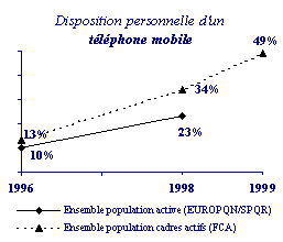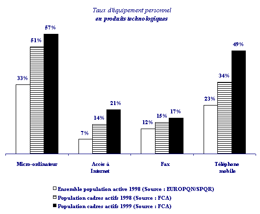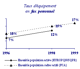 Concernant le fax personnel, il est présent chez 15% des cadres en 1998 et le taux d''équipement continue à progresser (17% en 1999) En 1996, 13% des cadres étaient équipés d''un téléphone mobile versus 10% de l''ensemble de la population active. L''équipement à titre personnel prend le pas sur l''équipement à titre professionnel. |
