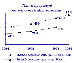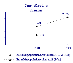 L''équipement qui marque le plus la différence est l''accès au réseau Internet. En 1998, 7% seulement de la population active y a accès versus 14% des cadres actifs pour la même année.