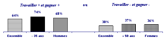 Moins de travail pour un salaire moindre est une situation minoritaire mais que les cadres envisagent de plus en plus (30% en 1999 vs. 27%) et plus particulièrement : En revanche, 74% des jeunes feront le choix de travailler + et gagner + vs. 71% en 1997. |