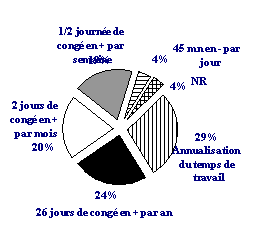 · Un tiers des cadres serait favorable à l''annualisation du temps de travail. Un quart des cadres souhaiterait 26 jours de congés supplémentaires (un tiers chez les jeunes). Un autre quart opterait pour deux jours de congés supplémentaires. |