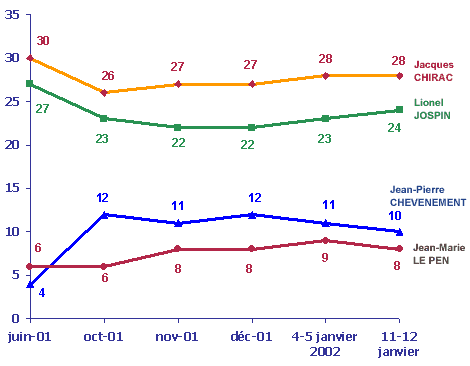SONDAGE EFFECTUE POUR: LE FIGARO et EUROPE 1 DATE DU TERRAIN: Les 11 et 12 janvier 2002. ECHANTILLON: 947 personnes constituant un échantillon national représentatif de la population française âgée de 18 ans et plus et inscrite sur les listes électorales. METHODE: Echantillon interrogé par téléphone Les résultats d'intentions de vote ne sont pas une prévision du résultat électoral. Ils donnent une indication significative de l'état du rapport de forces politiques actuel et n'interdisent aucune évolution future, notamment en fonction de l'impact de la campagne électorale. Comme pour toute enquête quantitative, cette étude présente des résultats soumis aux marges d'erreur inhérentes aux lois statistiques. | ||