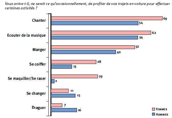 En règle générale, les femmes chantent plus que les hommes dans leur voiture (69% contre 54% pour les hommes), écoutent plus la musique (62% contre 54%), mangent davantage (52% contre 40%), se coiffent davantage (28% contre 13%) et se maquillent ou se rasent plus (29% contre 2%). Mais ce sont les hommes de 18-25 ans qui déclarent se changer plus (15% contre 11%) , draguer plus (16% contre 7%) et davantage flirter/faire l’amour (14% contre 7%). Pour cette dernière activité, il est amusant de constater que deux fois plus d’hommes déclarent la pratiquer que les femmes : excès de vantardise masculine ou discrétion féminine ?
