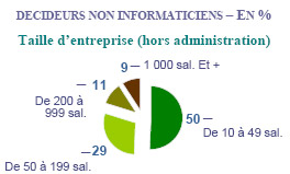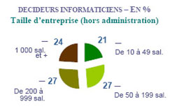Tout en étant bien représentés dans toutes les entreprises, les décideurs informaticiens sont implantés en grande partie dans les grandes entreprises : 27% dans les entreprises de 200 à 999 salariés et 21% dans celle de 1 000 salariés et plus. 50% des non-informaticiens travaillent dans les entreprises de 10 à 49 salariés.