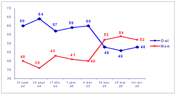 | Les partisans du « Non » | 37 | 51 | 40 | 41 | 29 | 29 | 59 | 24 | 63 | 22 |
