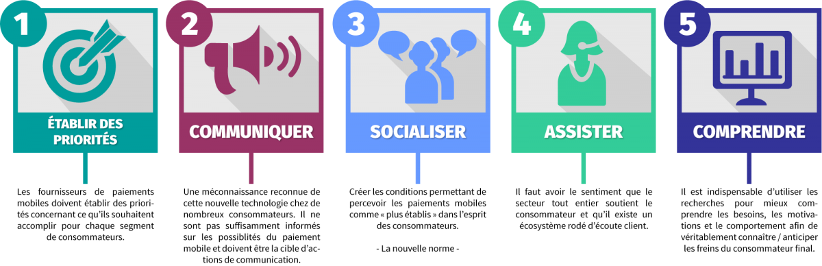 - Montrez aux consommateurs les avantages des paiements mobiles, mettez en avant leur simplicité et expliquez-leur comment d’autres personnes les utilisent. Les consommateurs prudents ont besoin de voir d’autres personnes utiliser les paiements mobiles afin d’éveiller leur intérêt et les communications peuvent y contribuer fortement.