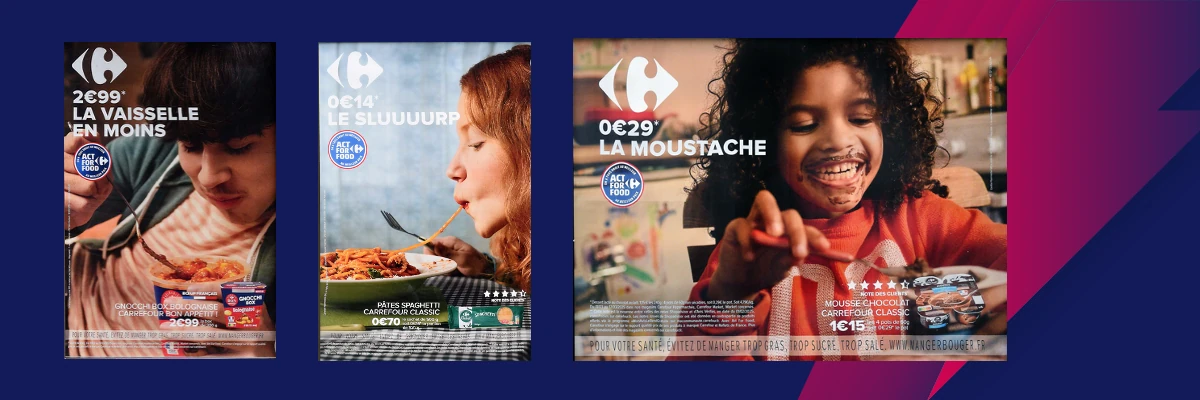 La campagne affichage est combinée avec un soutien en TV autour du lien intergénérationnel où les produits de la marque Carrefour sont aussi source de plaisir à petit prix. Le parti-pris est simple, ancré dans le quotidien mettant en scène de vraies personnes avec une touche d’humour qui dénote dans le secteur Distribution habitué à la combinaisons produit / promotion.