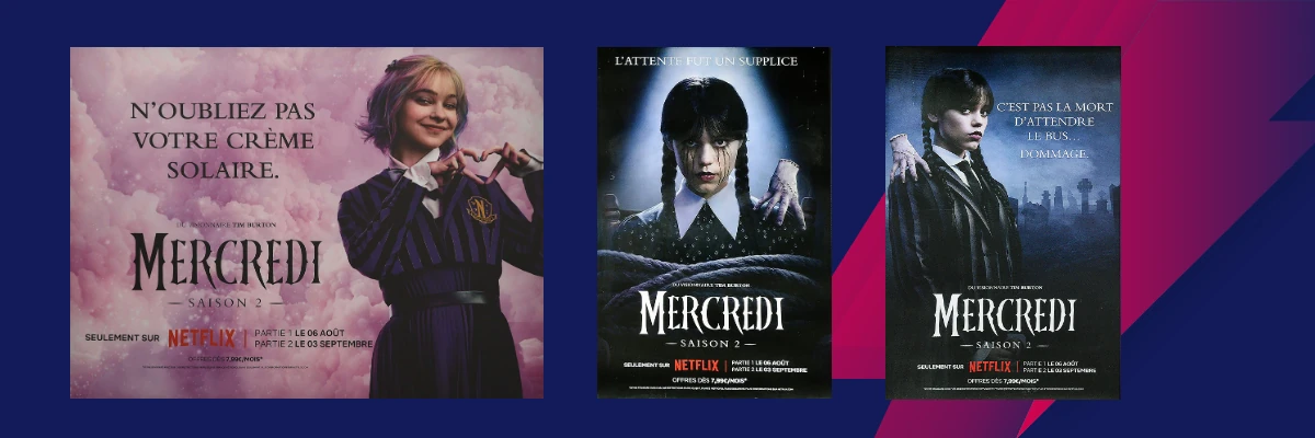 Incarnée par Jenna Ortega, « Mercredi Addams enquête sur une série de sombres mystères tout en se faisant des amis (et des ennemis) à l'Académie Nevermore ». Définie comme « brillante, sarcastique et un peu morte à l'intérieur », Mercredi est à l’affiche de la campagne avec un parti-pris : jouer avec la situation et l’environnement.