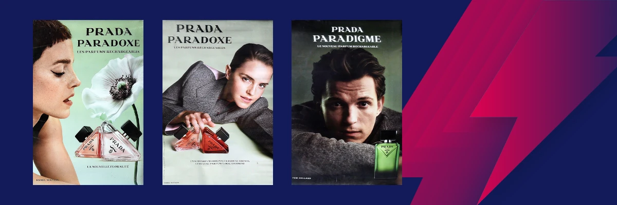 Emma Watson et Tom Holland sont les visages et les créateurs de la campagne Prada Paradoxe. La première réalise Paradoxe en 2022 et le second photographie Paradigme en 2025 pour explorer le concept d’identité dans un message unisexe et actuel.