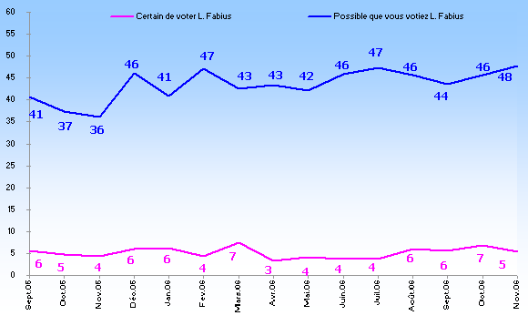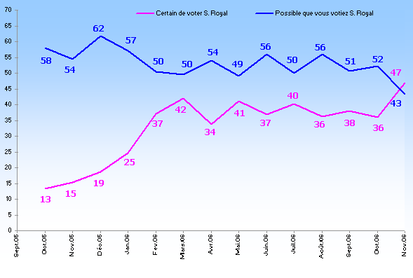 Les intentions de vote concernant l'investiture du candidat socialiste ont été posées à 504 sympathisants du PS, issus de deux échantillons nationaux représentatifs de la population française âgée de 18 ans et plus et comprenant 1880 personnes. Interrogation les 3 et 4 novembre (240 sympathisants socialistes) et les 9, 10 et 11 novembre 2006 (264 sympathisants socialistes).