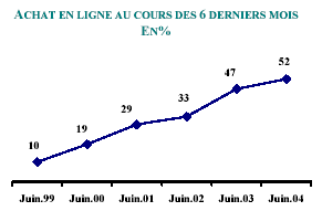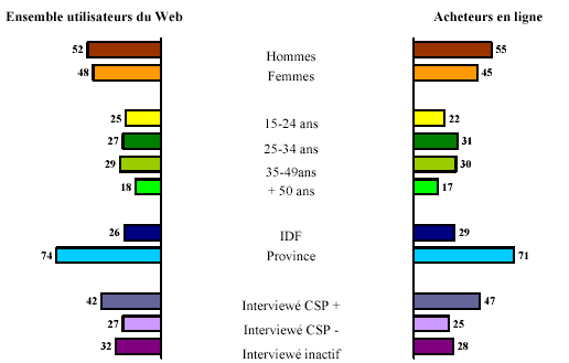 Internet s'est désormais imposé comme un nouveau circuit de distribution : la proportion d'internautes ayant réalisé des achats en ligne est passée de 10% en juin 1999 à 52% en juin 2004. ![]() PROFIL DES INTERNAUTES AYANT REALISE UN ACHAT EN LIGNE AU COURS DES 6 DERNIERS MOIS EN % Par rapport à l'ensemble des internautes, le profil des acheteurs en ligne présente des aspérités sur les critères suivants :