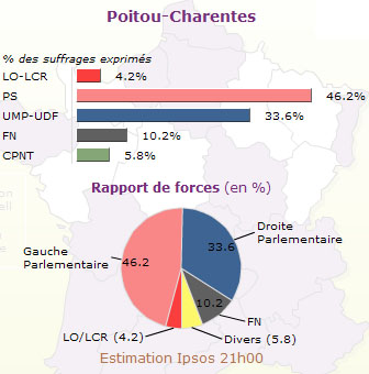 L'enquête Ipsos-Le Point sur la situation politique en Poitou-Charentes dans la perspective des élections régionales de mars 2004 révèle que la région pourrait basculer à gauche. La liste commune du Parti Communiste, du Parti Socialiste et des Verts conduite par Ségolène Royal est aujourd'hui en tête des intentions de vote premier et second tour.