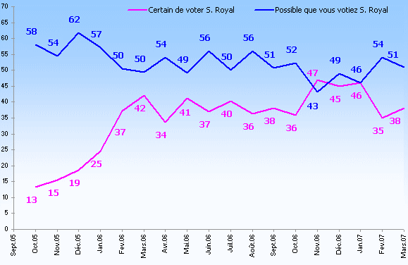 | Vous seriez certain de voter pour elle % | Il serait possible que vous votiez pour elle % | Total Potentiel électoral % | Potentiel vs Février 2007 | Rappel | |
