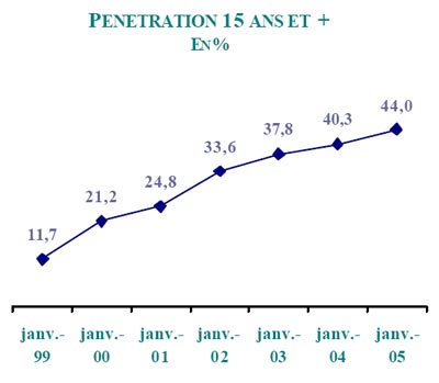 Le nombre d'internautes en France a encore progressé de 10% au cours des douze derniers mois pour atteindre 21.6 millions d'Internautes, soit 44% de la population française (15 ans et plus). Le profil sociodémographique des internautes, même s'il tend d'année en année à se rapprocher du profil de la population française, est toujours singulier : 54% d'hommes (vs 48% pop. 15 ans et plus), 50% de moins de 35 ans (vs 32%), 44% de CSP+ (vs 24%), 19% d'étudiants (vs 11%) et 26% de franciliens (vs 19%). |