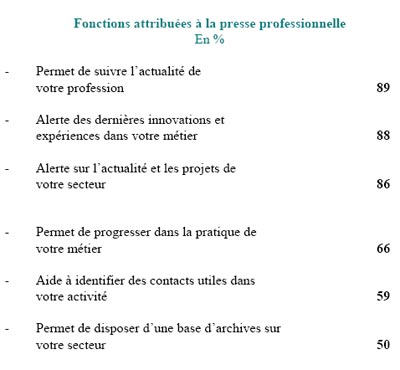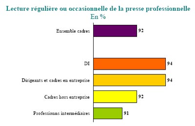 La lecture des cadres En 2005, La France des Cadres Actifs a mesuré l’audience de 78 titres de presse à titre individuel. Les résultats de l’édition 2005 de La France des Cadres Actifs sont globalement stables avec cependant des évolutions contrastées selon les familles de presse. On peut noter également une évolution favorable pour les titres à longue périodicité. 94% de la population cadre a lu au moins un des titres étudiés pendant leur dernière période de parution (LDP). Le nombre moyen de titres lus, pendant leur dernière période de parution, s’établit à 6.2. Les dirigeants et cadres en entreprise ont lu davantage de titres (7 titres en moyenne) que les cadres hors entreprise (5.9 titres) et que les professions intermédiaires (5.7 titres). La lecture de la presse professionnelle La presse professionnelle est un véritable outil de travail au quotidien puisque 92% de la population cadre déclarent la lire régulièrement ou occasionnellement. Ils sont 94% parmi les cadres de la cible « Décision Influence » et 95% parmi les dirigeants et cadres des entreprises de 500 salariés et plus. 2 cadres sur 3 déclarent avoir consulté le dernier numéro paru d’un des titres de la presse professionnelle de leur secteur et c’est le cas pour 79% des cadres de la cible « Décision Influence ». On notera également que les cadres de 50 ans et plus ont davantage consulté le dernier numéro de la presse professionnelle de leur secteur que l’ensemble des cadres (71% vs. 67%). Les fonctions de la presse professionnelle La fonction reconnue à la presse professionnelle par les cadres est avant tout l’aspect « outil de veille ». Grâce à cette presse, ils peuvent être alertés sur l’actualité de leur profession, des nouveaux produits et des nouveaux projets de leur secteur. Dans un deuxième temps, elle est utile au quotidien puisqu’elle permet de progresser dans la pratique de son métier, aide à l’identification des contacts utiles et permet de disposer d’une base d’archives sur les secteurs. La possibilité de progresser dans la pratique de son métier grâce à la presse professionnelle est fortement ressentie chez les cadres hors entreprise puisque 75% d’entre eux lui attribuent cette fonction (vs. 66% dans l’ensemble des cadres). La fonction de base d’archives sur un secteur est également citée davantage par les cadres hors entreprise (57% vs. 50% dans l’ensemble cadres). Du côté de l’entreprise, les dirigeants et cadres, quant à eux, reconnaissent davantage à la presse professionnelle, un rôle d’alerte sur les dernières innovations et expériences dans leur métier (91% vs. 88%). |