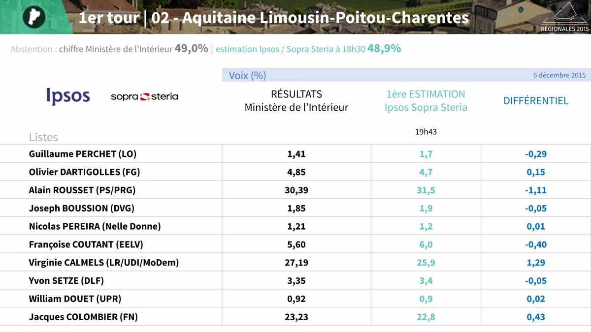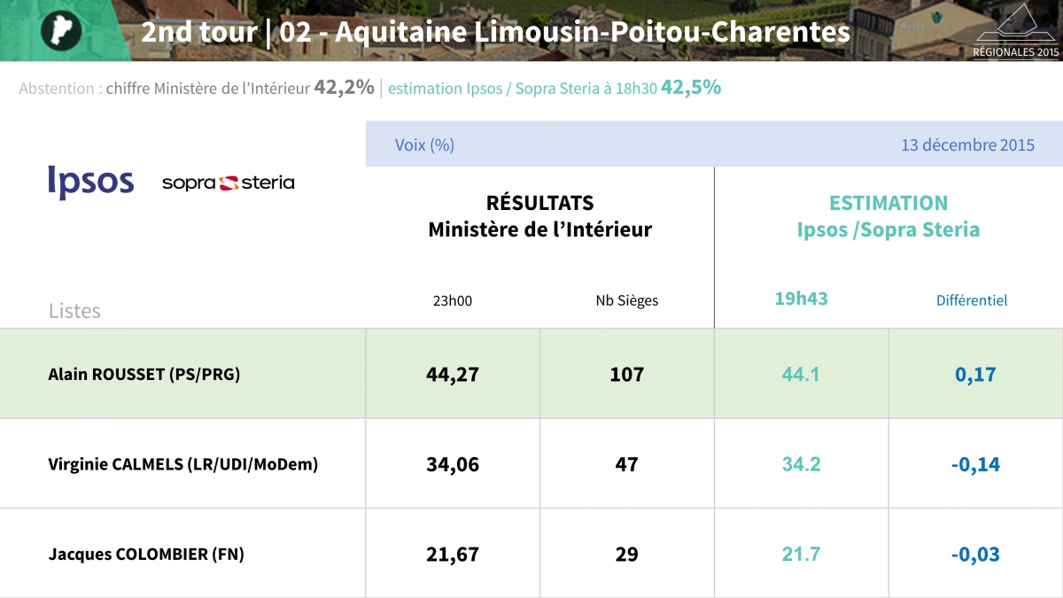 Président sortant de l’Aquitaine, Alain Rousset est largement élu en région Aquitaine-Limousin-Poitou-Charentes. Sa liste remporte la triangulaire de second tour avec plus de dix points d’avance sur la liste de droite de Virginie Calmels (44,3% contre 34,1%).