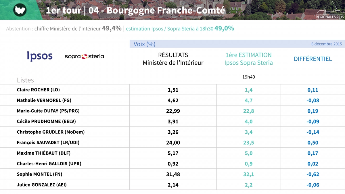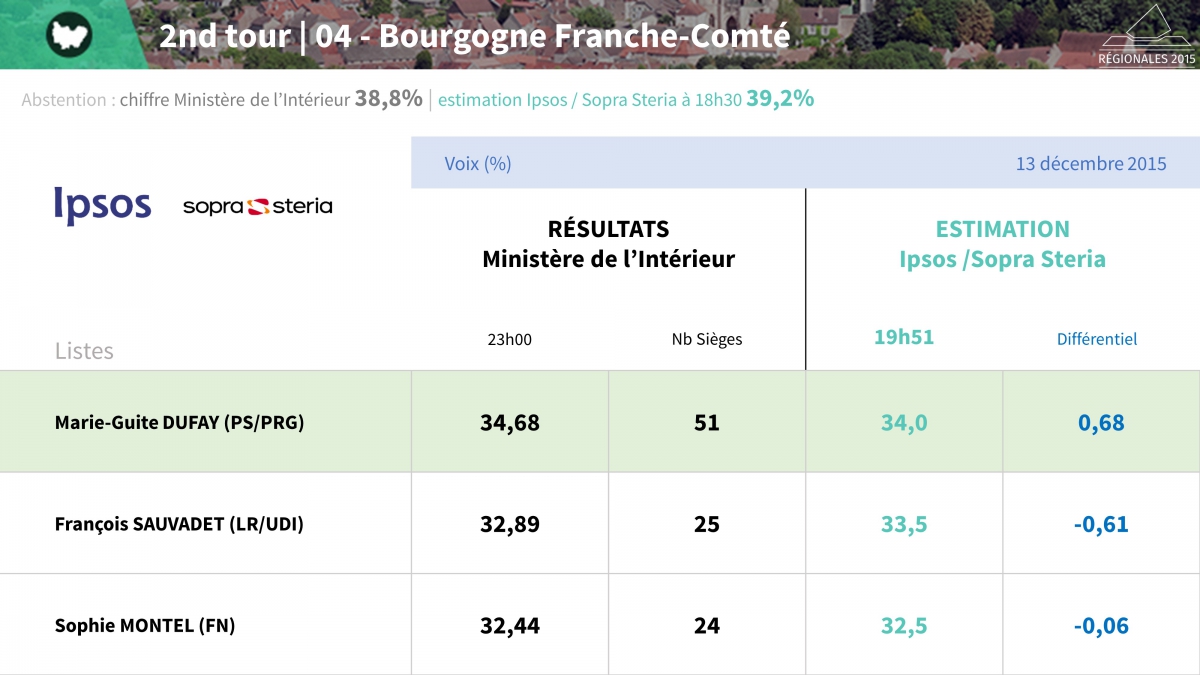 La présidente socialiste sortante de Franche-Comté, Marie-Guite Dufay, s’impose de justesse dans la triangulaire de second tour avec 34,7% des voix, contre 32,9% pour la liste de droite de François Sauvadet et 32,4% à la liste FN de Sophie Montel. Le FN améliore son score d’un point par rapport au premier tour. Il arrive en tête de la triangulaire dans trois des huit départements de la région, en Haute-Saône (38,5%), dans l’Yonne (37,6%) et dans le Territoire de Belfort (35,3%).