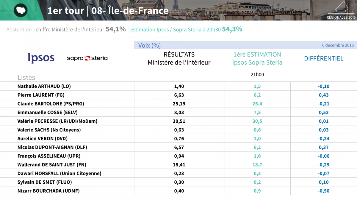 Dirigée par la gauche depuis 17 ans, l’Île-de-France bascule à droite. La liste conduite par Valérie Pécresse obtient 43,8% des suffrages, contre 42,2% à celle du président de l’Assemblée Nationale Claude Bartolone et 14% au FN de Wallerand de Saint Just. Le FN est en baisse de 4,5 points par rapport au premier tour : l’Île-de-France est, avec Auvergne-Rhône-Alpes, une région où le vote « utile » de l’électorat frontiste en faveur de la droite a été décisif. Valérie Pécresse l’emporte en Seine-et-Marne, dans les Yvelines, dans les Hauts-de-Seine et dans le Val d’Oise. Claude Bartolone est en tête de la triangulaire en Seine-Saint-Denis, dans le Val de Marne et à Paris (49,6% contre 44,3%). Les deux candidats sont quasiment à égalité (40,9%) dans l’Essonne.