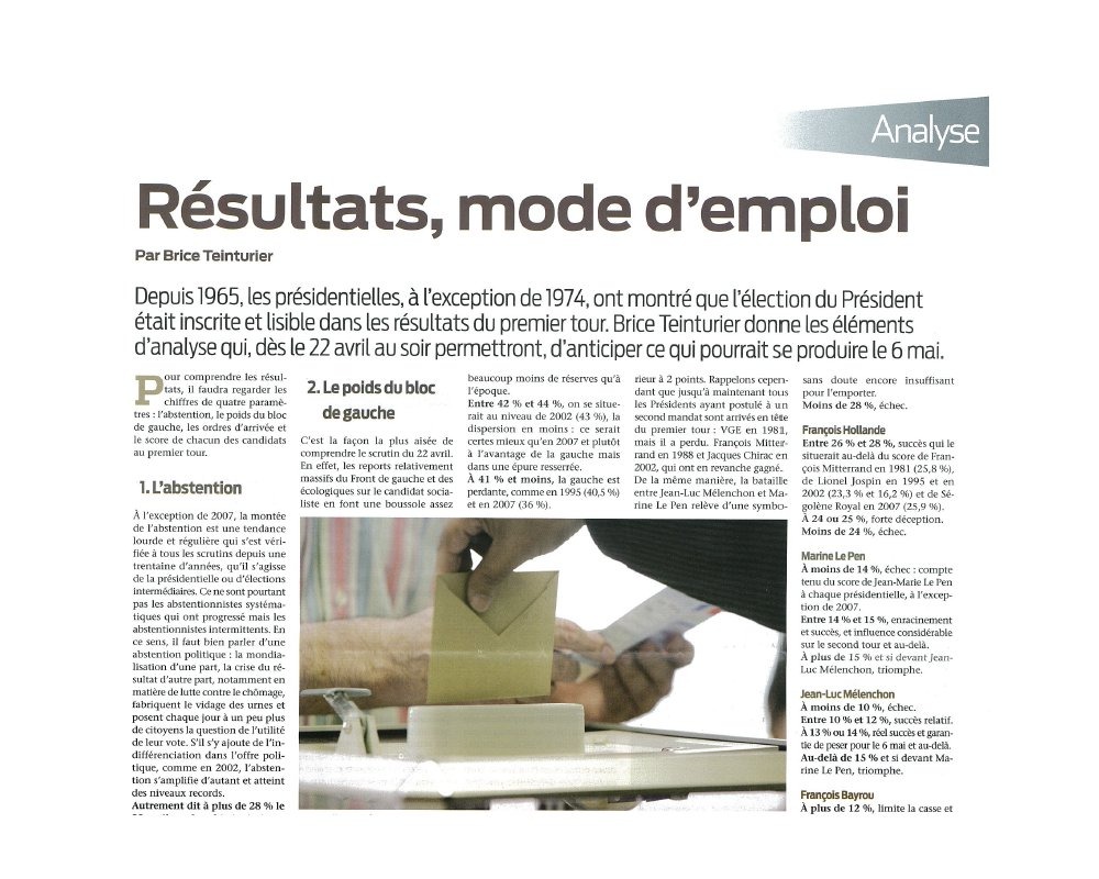 Les ordres d’arrivées : c’est une variable secondaire par rapport au poids des blocs et dont l’importance est avant tout symbolique. Ce qui ne veut pas dire qu’elle est négligeable. Si Nicolas Sarkozy est légèrement derrière François Hollande, il cumulera une difficulté arithmétique à une difficulté symbolique, puisque c’est son équipe qui a fait du « croisement des courbes » un enjeu tout au long de la campagne. S’il est légèrement devant mais que la gauche est à 44/45% ou plus, l’avantage symbolique est faible par rapport à l’arithmétique. Si en revanche il est légèrement devant et que la gauche se situe à 43% ou moins, l’ordre d’arrivée devient important, et ce a fortiori si l’écart est supérieur à 2 points. Rappelons cependant que jusqu’à maintenant, tous les Présidents ayant postulé à un second mandat sont arrivés en tête du 1er tour : VGE en 1981, mais il a perdu. François Mitterrand en 1988 et Jacques Chirac en 2002, qui ont en revanche gagné.