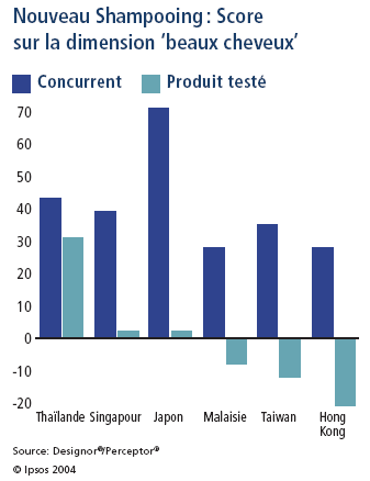 Perceptor,SM le produit d’Ipsos Novaction & Vantis conçu pour modéliser les perceptions et le positionnement des marques, a permis de révéler des différences régionales significatives dans la manière dont les consommateurs perçoivent les marques de shampooing. En Europe, les consommateurs lient le bénéfice final attendu d’un shampooing – de beaux cheveux – à leur perception des fonctionnalités du produit. Ceci favorisait la marque testée qui revendiquait un bénéfice très fonctionnel. Pour les Asiatiques, en revanche, le bénéfice fonctionnel et la beauté des cheveux sont des idées totalement différentes et constituent deux ‘drivers’ distincts. En clair, pour que la marque ait du succès en Asie, elle ne pouvait compter sur le bénéfice fonctionnel pour susciter la perception de beauté.