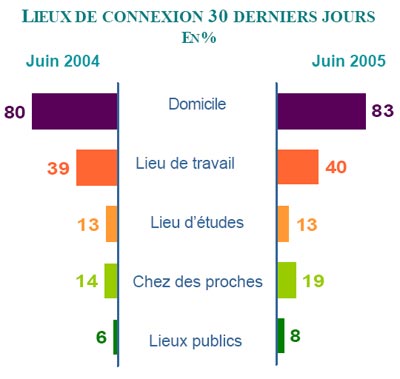 Plus de 8 internautes sur 10 se sont connectés au web au cours des 30 derniers jours depuis leur domicile, une proportion en progression sur les 12 derniers mois.Si la connexion via un accès sur le lieu de travail et le lieu d'études connaît un certain plafonnement, elle est en revanche en expansion depuis le domicile de proches (famille, amis, …) et les lieux publics (cybercafés, bornes publiques, …).